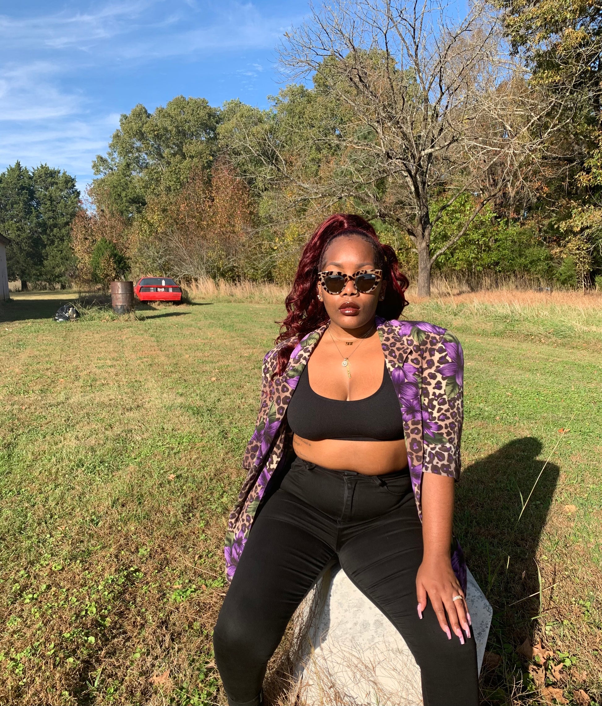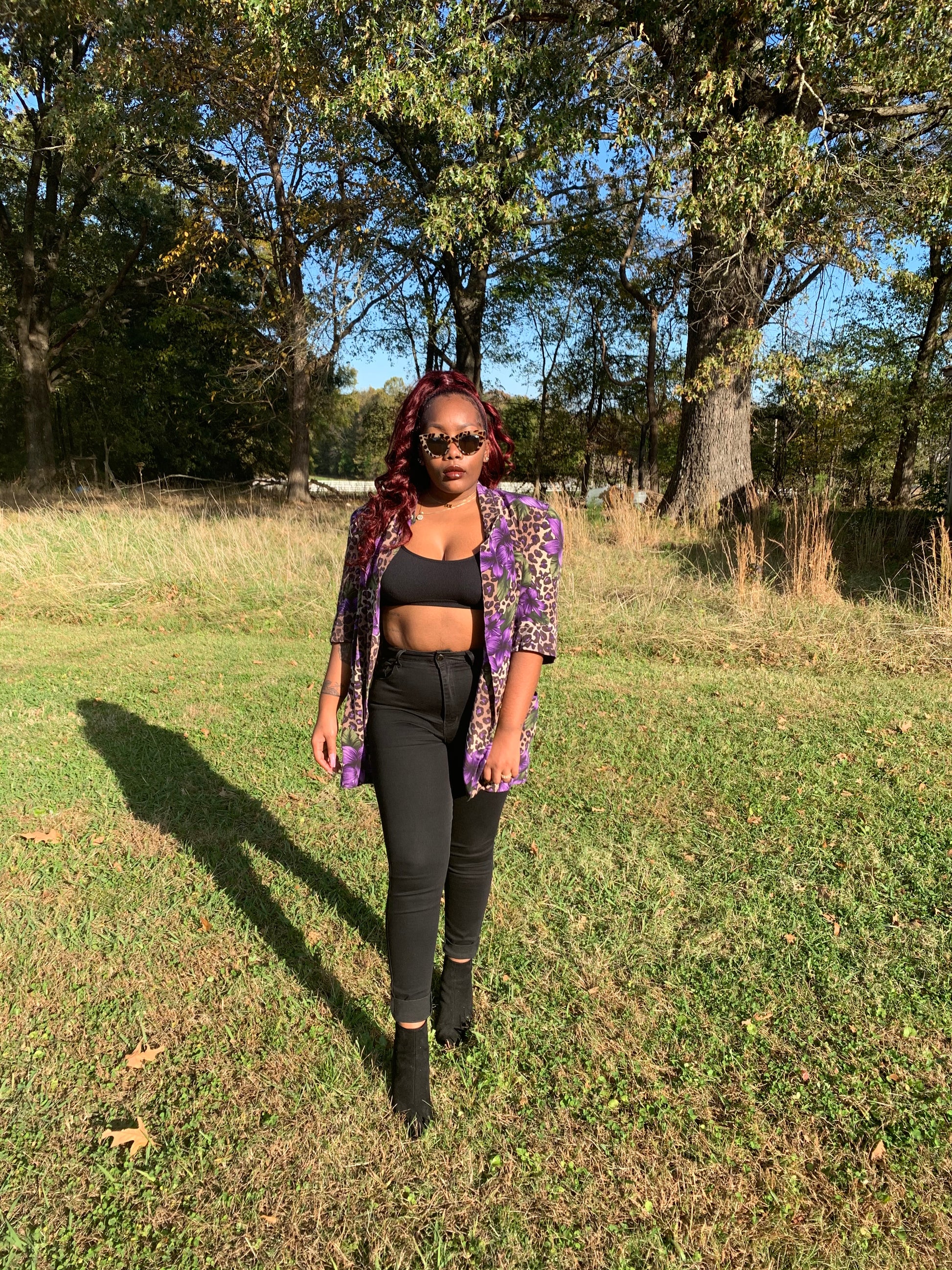 Talk about an attention grabber!! This purple & cheetah print blazer is amazing. It’s a really dope floral and animal print mix that’ll make a beautiful look! Features iconic shoulder pads, which can be removed. Fits up to at least a L.